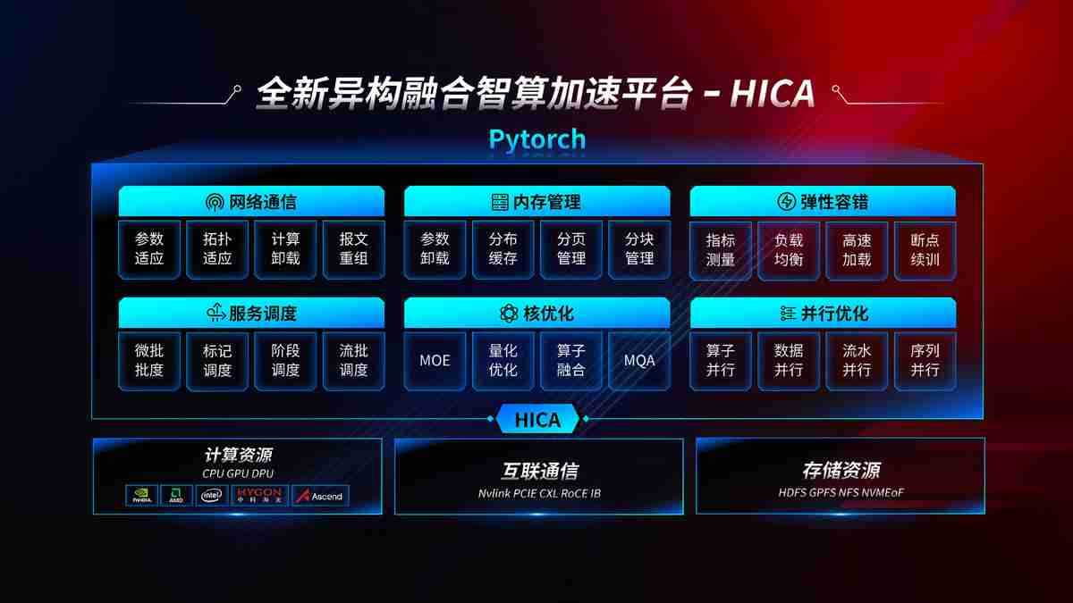 通过自研的服务层、、中间适配层、、、、以及调度编排算法,,,采用数据并行、、、、模型并行等多种并行方式,,,,把并行计算任务进行有效的分解,,,使其分别由相应的软件栈和算力资源来承接。。。。当GPU资源变化,,HICA可以实时动态调度计算子任务并调整模型拓扑和架构,,,以充分聚合各种算力资源。。
