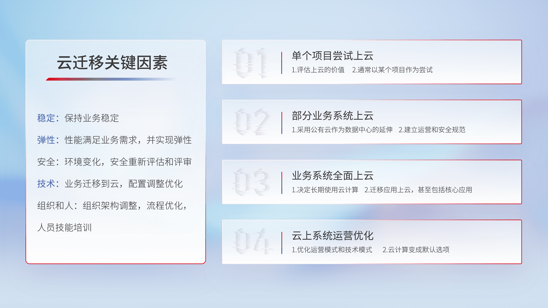 结合实际业务,,从规划设计、、云平台选型、、、、云原生改造、、数据迁移、、、、集成交付,,,迁移全过程为客户识别最佳上云路径,,做好风险识别管理,,设计网络架构、、身份权限、、、安全审计合规、、、、操作审计、、、日志审计、、监控告警策略、、、多站点容灾设计等,,对云上基础设施进行整体规划,,,,提升IT治理水平,,,,以满足弹性、、、高可用、、、高性能的需求。。。。