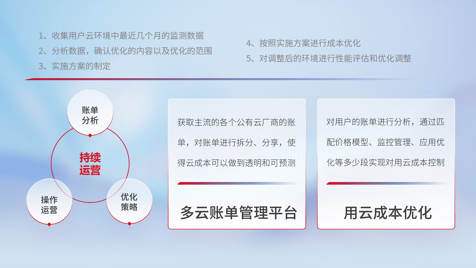 通过多云纳管,,,以统一的资源数据模型把客户的云资源进行抽象和封装,,,,进而实现对多云资源的统一操作,,,保障云资源管理的可靠性、、稳定性与可用性。。量身定制化运维内容,,,配置、、、、开发运维、、、、补丁管理、、、备份、、、监控、、、、认证和访问管理、、审计和日常巡检等,,,,保障在用云过程中的可靠度,,,,稳定度以及高可用率。。。。