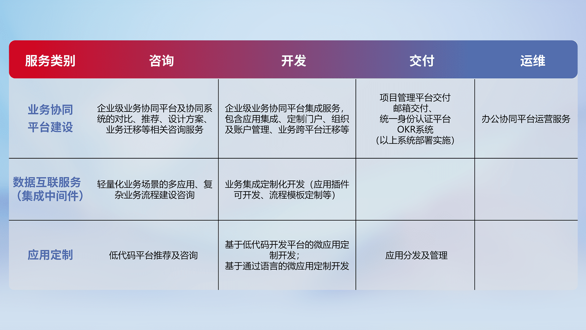 针对钉钉、、、、企微、、、、IDaas等平台级产品提供产品的规划、、方案、、、、交付、、、、定制化开发等服务,,,实现如统一协同办公、、、智能客户服务、、、混合会议管理、、智能数据查询、、、、等业务场景,,实现数字化转型。。